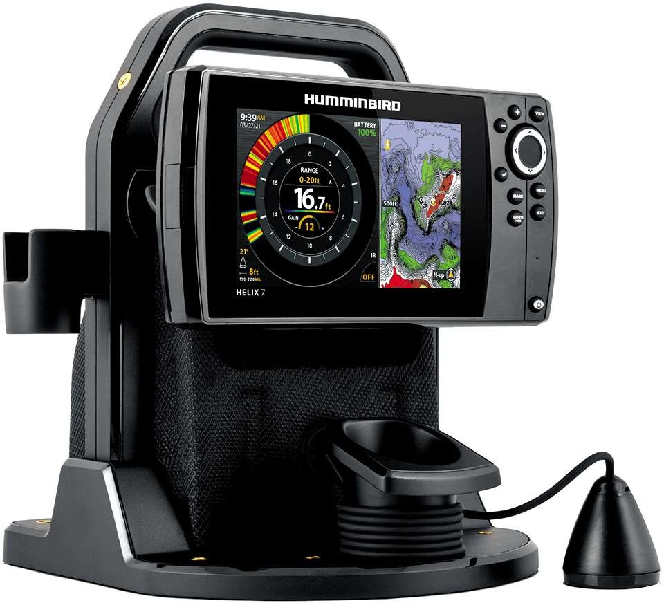 - What’s Included: ICE HELIX 7 CHIRP GPS G4 fishfinder, Dual Spectrum CHIRP ICE transducer, 15Ah lithium battery with 2 USB ports and battery life indicator, charger, ICE shuttle, hardware, quick-connect SAE power cables, and silicone screen cover.
