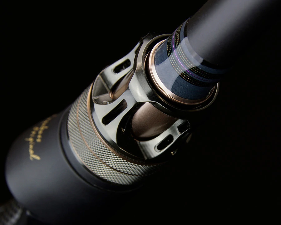 Weight-saving improvements in blank construction, thread wrapping method, reel seat and head locker design result in a lighter rod, which allows for lighter counterweights to achieve the ideal “Takumi” balance for each application. Even the F6-69X, which is balanced for a tip-up posture for heavy-cover applications utilizes a mere 8g counterweight contained in the End Balancer’s machined metal form. To reflect this achievement, the shining gold end cap emblem of previous generations has been updated to an understated “Bronze Meteo” finish.