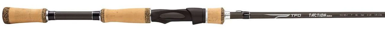 Tournament inspired in its build quality and design, the Temple Fork Taction Bass Spinning Rods offer a range of models that have exceptional feel with lightweight form. Each rod utilizes an intermediate modulus carbon fiber, maintaining great strength and responsiveness without sacrificing sensitivity. A non-glare charcoal finish offers a more traditional look to this modern rod, keeping unwanted reflections from hindering your day. SeaGuide Hi-Grade marine grade stainless steel guides with LS inserts offer smooth flow for optimal casting performance along with durability to last for seasons of use to come. Premium cork furniture with burl accents offers great comfort for all day use, while a Fuji feel through reel seat provides enhanced bite detection. Each rod is finished off with a clip style hook keeper to secure your baits as well as TFO’ s color coding system to assist with quick identification of your preferred rod. All Taction rods come with TFO’ s full lifetime warranty against defects, keeping piece of mind in your investment.
